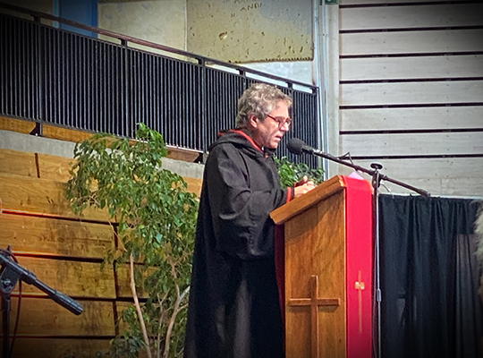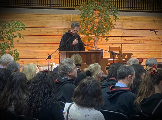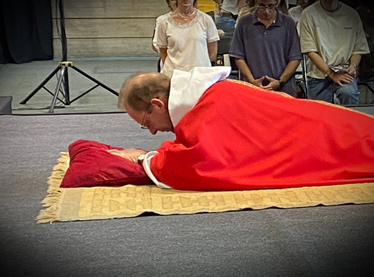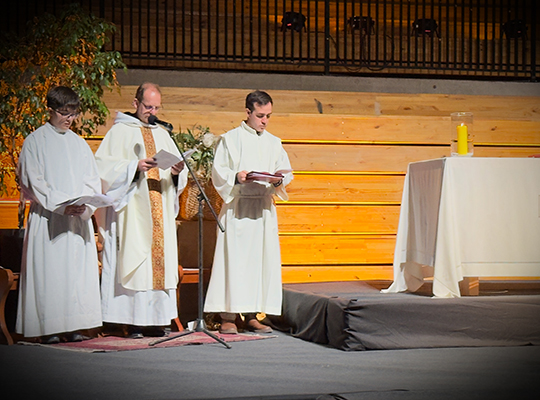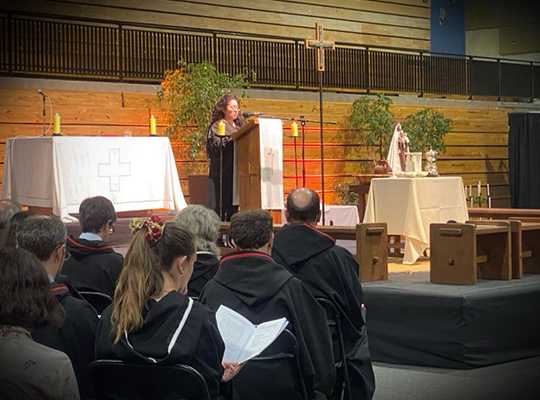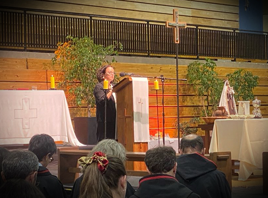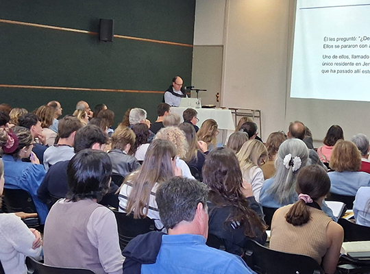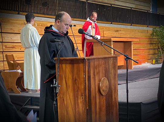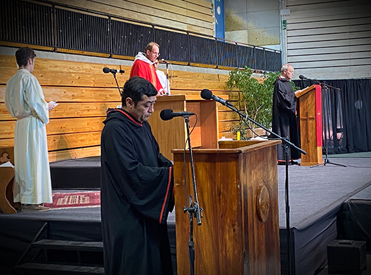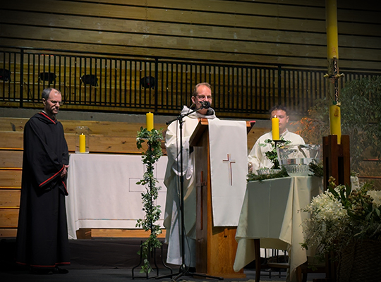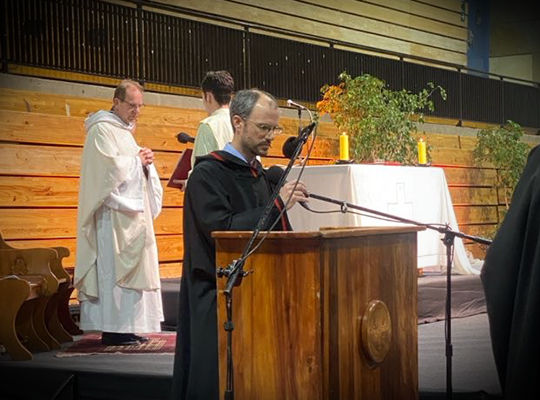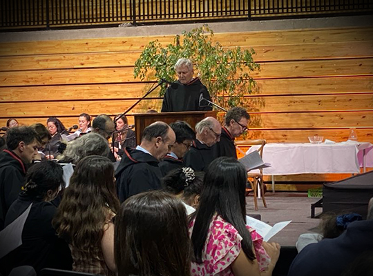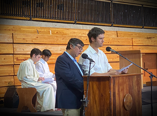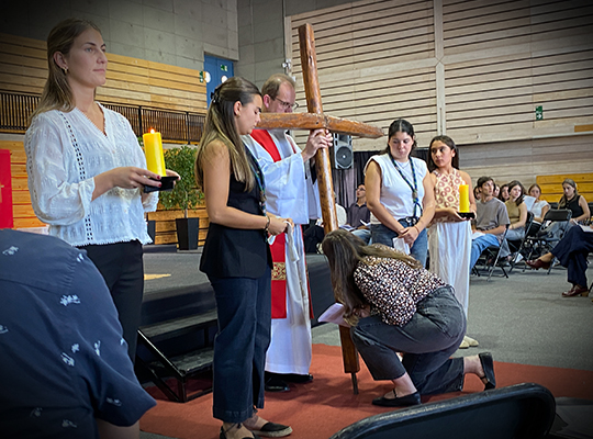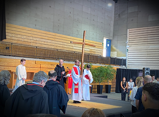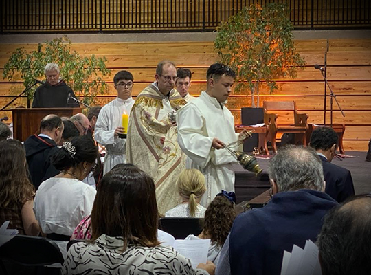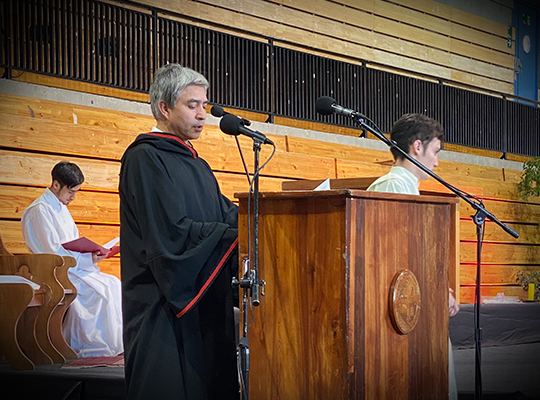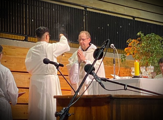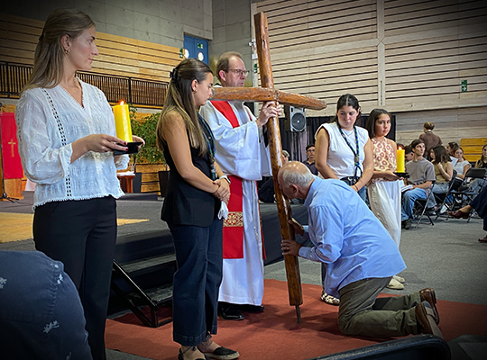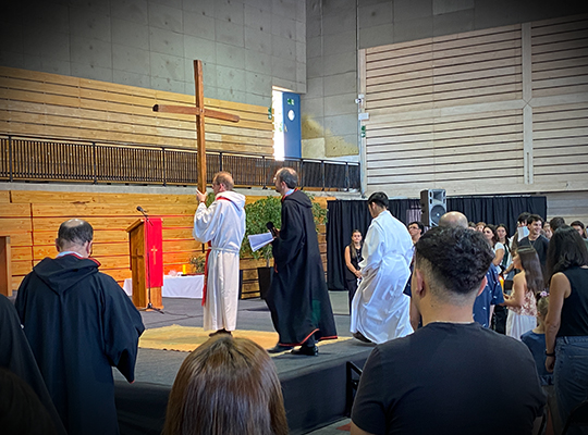 Bajo este lema , Cristóbal Valdés, oblato, reflexionó en torno a la lectura de los discípulos de Emaús, invitando a reconocer a Cristo que va con nosotros por el camino siempre: “Hay en estas frases una pedagogía muy amable, amabilísima diría yo, del Señor Resucitado. Recordemos que vamos en la dirección equivocada, alejándonos de Jerusalén, y que sus ojos son incapaces de reconocerle. Pero el Señor no les echa en cara ni su dirección ni su incapacidad- al menos no al tiro, como vamos a ver más adelante. En vez de eso les pregunta ¿de qué van conversando? Y para que saquen fuera todo lo que les pesa en el corazón, admite que lo consideren un despistado -el único que no sabe lo que ha pasado- e insiste preguntando ¿qué cosas? Y nosotros, ¿de qué vamos discutiendo por el camino? Creo que la pregunta está planteada hacia nosotros, especialmente porque se nombra a Cleofás, pero no al otro que caminaba con él, de modo que la lectura queda abierta hacia mí. ¿De qué voy yo discutiendo por el camino de la vida? ¿Cuáles son las cosas que ocupan mi mente? ¿Qué estoy esperando, temiendo, anhelando, murmurando? ¿Qué dice ese ‘run run’ constante de mis pensamientos?”. Reflexionó en torno a la Liturgia de la Adoración de la Cruz: “Besamos la cruz porque es la cruz de Cristo, porque ella sostuvo su cuerpo y recibió su sangre preciosa. Pero en este gesto se produce una nueva superposición, que es la de su Cruz con nuestras cruces ”. ¡Y de hecho cargó con nuestros males y soportó nuestra dolencias!” (Is 53, 3), nos dijo Isaías en la primera lectura. Y en esta superposición terminamos besando precisamente nuestros males y nuestras dolencias, la muerte de los que amamos, la separación que nos entristece, el fracaso y la desilusión de la que veníamos conversando por el camino, llenos de pesar, cuando el Señor de incógnito se puso a caminar con nosotros”.