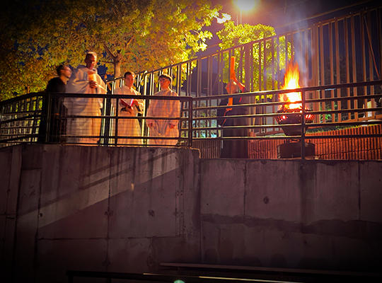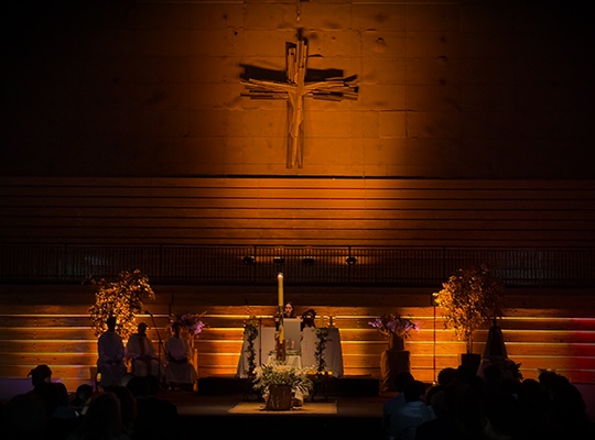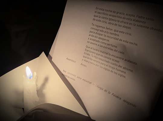 La noche del Sábado Santo culminamos la Semana Santa con la Solemne Vigilia Pascual, celebrando la victoria de Cristo sobre la muerte con su gloriosa Resurrección, simbolizada por el cirio, que con su luz rompe las tinieblas de la noche; seguido por Liturgia de la Palabra, en que recorremos nuestra historia de salvación y renovamos nuestras promesas bautismales, para terminar con la Liturgia Eucarística.
